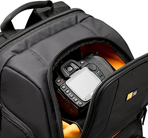 Backpack holds SLR camera body with attached zoom lens, laptop and additional accessories