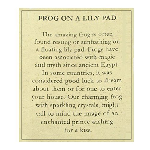 Frog on a lily pad brooch hand-set with sparkling clear crystal meticulously crafted by skilled artisans. The amazing frog is often found resting or sunbathing on a floating lily pad. Frogs have been associated with magic and myth since ancient Egypt. In some countries, it was considered good luck to dream about them or for one to enter your house.