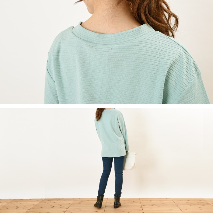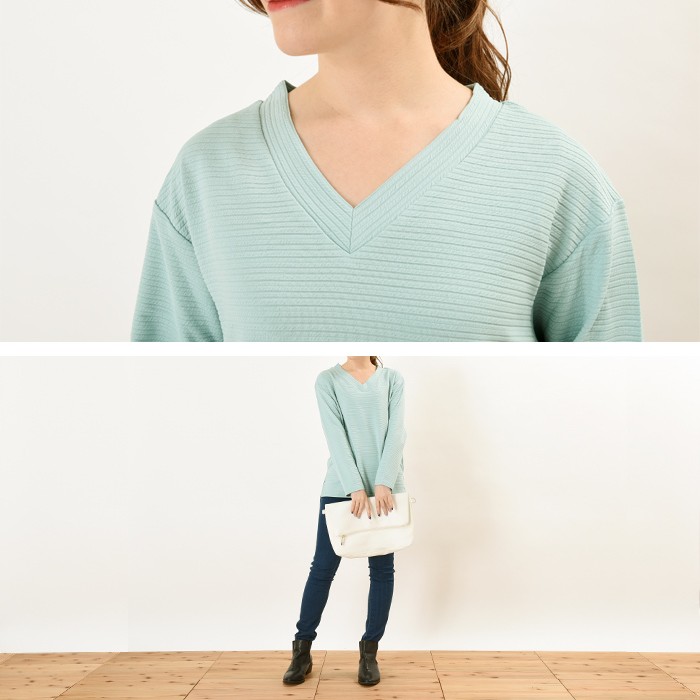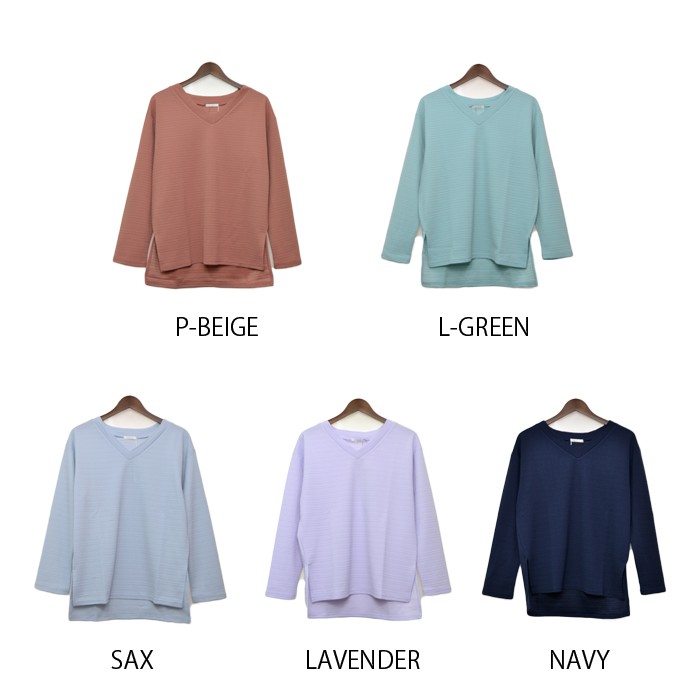 ふっくらと立体的な生地感で、オシャレな雰囲気のカットジャガード素材のプルオーバーです。無地でシンプルなので、着回しがしやすくコーディネートに取り入れやすいので幅広い年齢層の方に大人気です。胸元部分がVネックで首回りがすっきり見えて、着やせ効果も抜群ですまた、短めの丈感なのでボトムスと相性が良くワードローブにお使いいただけます。Mサイズ Lサイズ