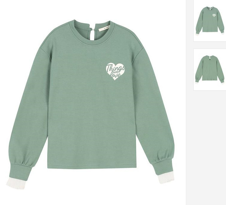 라이트 그린 컬러와 가슴 부분에 영문 레터링 장식으로 포인트를 준 티셔츠 입니다. 소매 부분에 쉬폰 레이어드 장식이 고급스러움을 더한 아이템 입니다.
