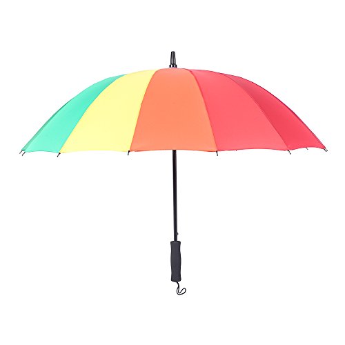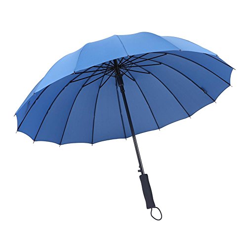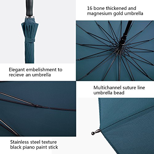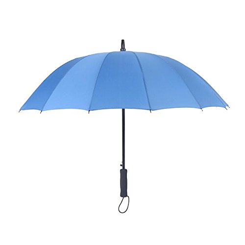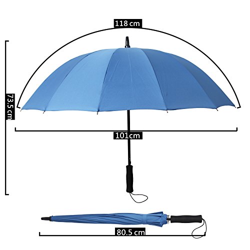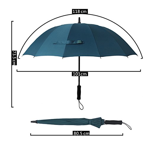 -. Feature : STURDY FRAME CONSTRCTURE, STRONG WINGPROOF: Made of 16 durable fiberglass ribs and aluminum alloy central shaft, making the umbrella strong sturdy and windproof. It won't flip inside out even in strong wind. Durability tested thousands of times to ensure it won't be broken in heavy rain. / MADE BY 190T PG, WATERPROOF, EASY TO DRY: The umbrella was made of high quality recycling PG fiber, durably to use for a long time. The water-repellent specific makes you more convenient to get in, even without flip, all the rain drops fall down quickly. / AUTO OPEN, COMFORTABLE GRIP: The umbrella is semi-automatic designed. You can automatically open it in just one second to avoid get wet in rain. Considering longer lifetime, the close feature is hand-driven. Thousands of times operation is stress-free for this straight umbrella. EVA handle makes you feel comfortable when hold and also reduce the total weight. / LARGE ENOUGH TO SHARE WITH LOVER : Measured 39 inches in diameter when open, 31.9 inches long when close. The sport umbrella is large enough for two persons. Lovers can also share this umbrella in rain, without fearing ruin the date. / A QUALITY TRUSTWORTHY UMBRELLA: The manufacturing process is strictly inspected to ensure each sport umbrella with high quality. To bring customers best use experience, most steps are completed by humans, so it's really a manual umbrella. If By some rare chance we missed a defective unit after our stringent quality control, a brand new one will be sent to you freely.