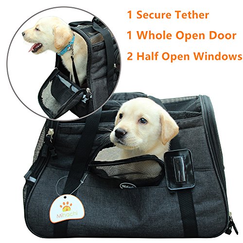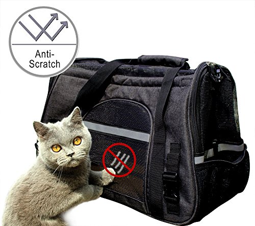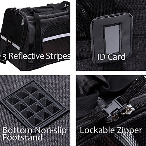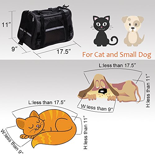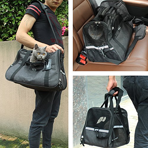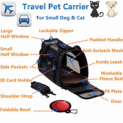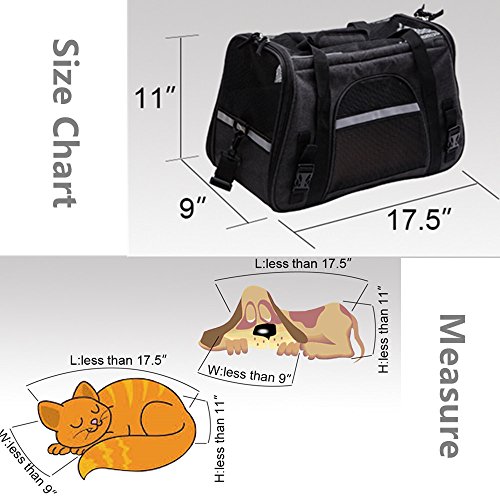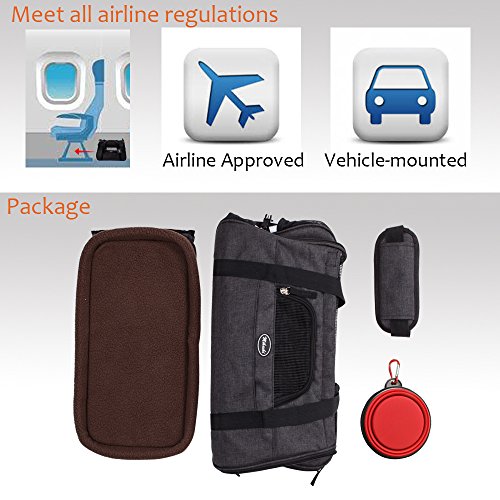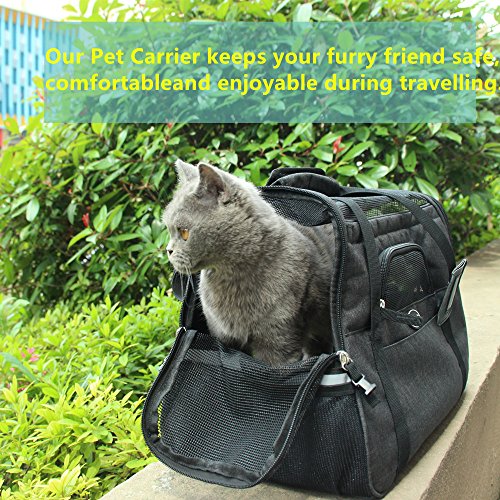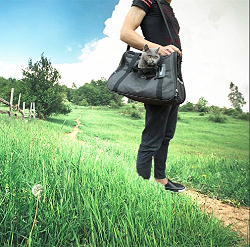Pets like this soft-sided bag, and do not like hard packs, because it makes them feel uncomfortable. This Travel Tote can make your pet have a good rest rather than become very irritable. The floor is firmly fixed under the mat, so even a heavy cat or dog, it will not be deformed. The waterproof material makes it easy to clean the inside and outside. There is a hand-held box-style handle, and a length-adjustable padded shoulder strap. The luxurious pet carrier is a durable and stylish bag that keeps your pet comfortable and it will fit for any small pets and cats. This product has a ventilated mesh at the top and around, so it can bring good air circulation, while both sides of the zipper opening to facilitate the pet into and out, increase convenience. Super canvas fabric, sturdy mesh, reinforced handle and storage bag. Suitable for portable walks, cars and airplanes. 0