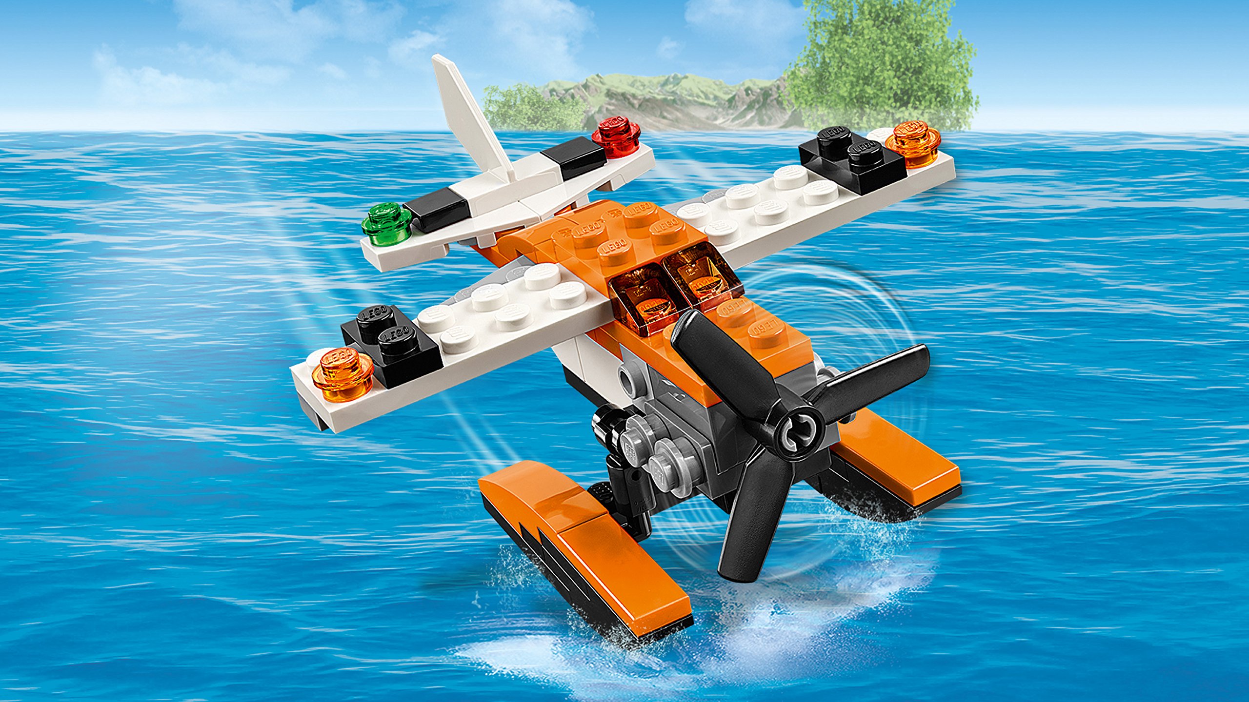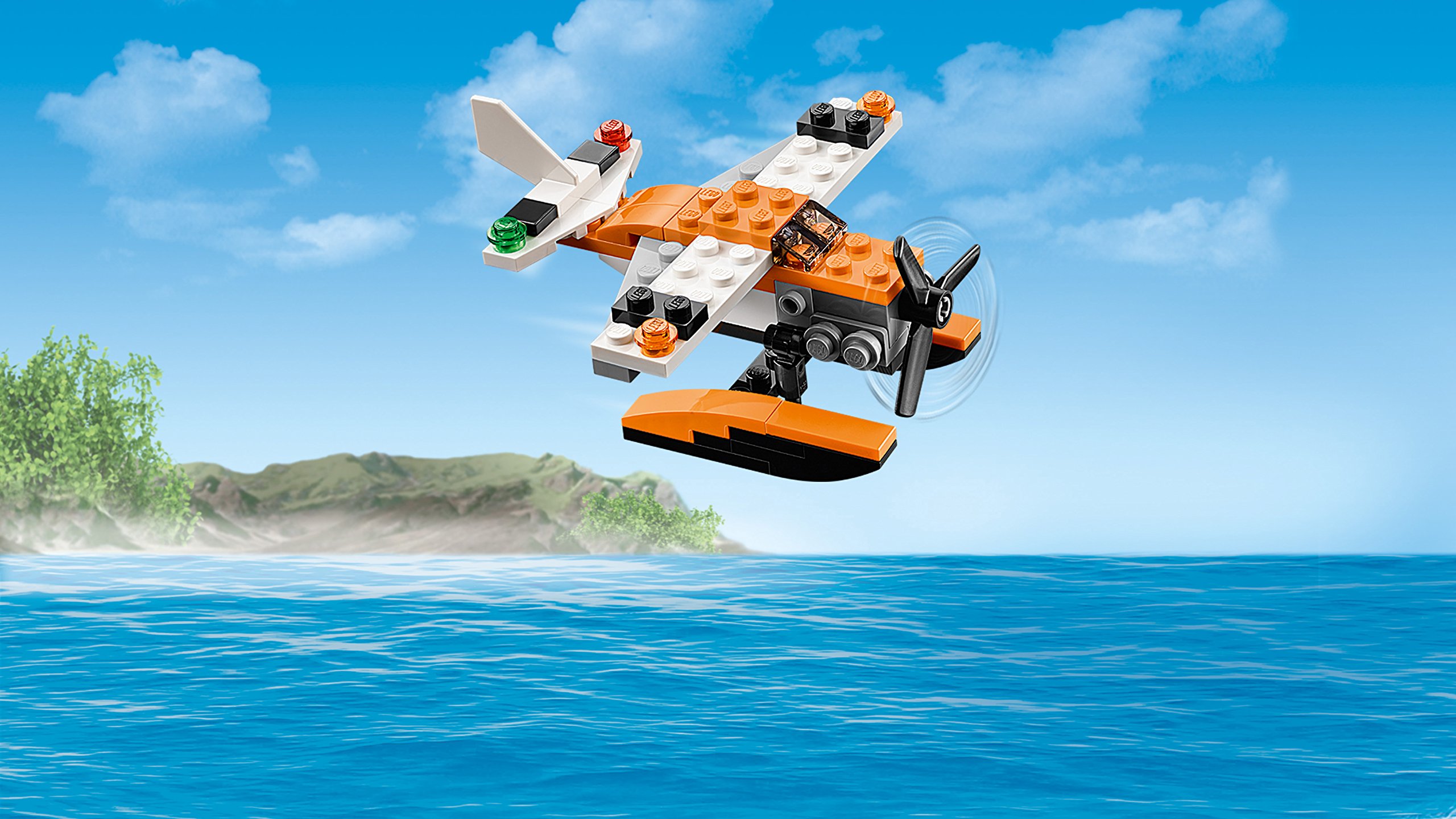 Let's fly to the sky by seaplane on the waves! The boasting of this aircraft with a combination of orange, black and white is a large propeller and elaborate engine, an airplane, an inclined windshield, a floating float