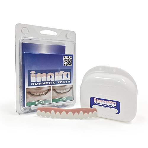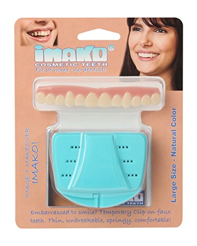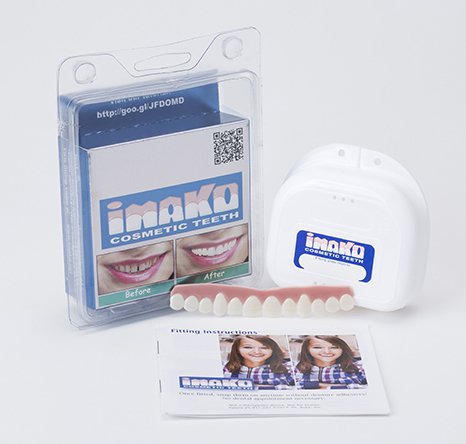 Studio : Imako Publisher : Imako Binding : Health and Beauty Product Description Imako Cosmetic Teeth® are the perfect solution for when Conventional Dentistry is not an option. Our product hides tooth loss and can be fitted over crowns, veneers, partials and bondings. Imako Cosmetic Teeth® are a product you can feel good about purchasing as they are made with care in the USA and FDA approved. Look good in photos, for special occasions and upscale events with no dental appointment necessary! Your purchase will arrive flat but be arch-shaped and springy once fitted. Additional molding is required to best fit the shape of your mouth. Our product is not a dental or therapeutic device and strictly for theatrical use if your reside within GA. Fitting: Measure across the width of the four front teeth. If it is closer to: 1-1/8th inches (28 mm.) order size SMALL 1-1/4th inches (32 mm.) order size LARGE 0 |