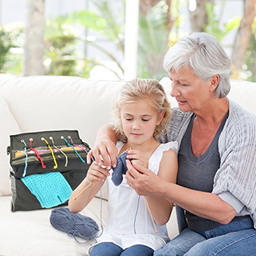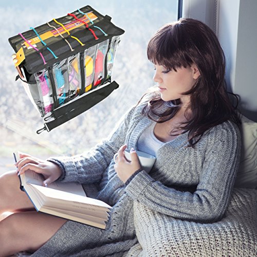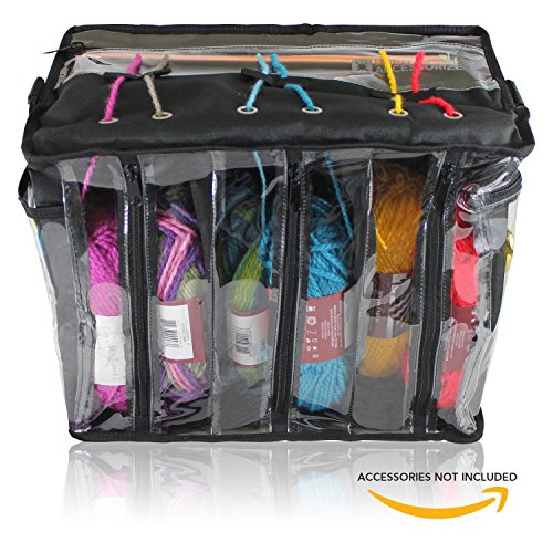 Made from clear 2mm PVC (vs. 1mm in competing products), premium polyester and durable zippers, the knitting tote has 7 compartments for crochet and knitting storage, finished product, patterns and needles (3 in the front, 1 large one in the back, 1 on top and 2 on both sides).
