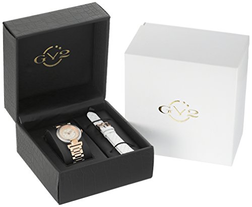 The sophisticated 37 mm GV2 Berletta adds an air of suave elegance to any woman's wrist. The timepiece features a clear white dial with a quilted pattern and 15 sparkling diamonds. This fine watch contains a rose gold IP stainless steel case with a blue cabochon on the crown and is adorned with a sparkling diamond cut bezel that immediately captures attention. Consisting of two interchangeable bands, a black leather with quilted design and a rose gold IP stainless steel one, to always give you that look of elegance. Powered by a Ronda 705 Swiss Quartz movement this watch is a limited edition to 500 pieces so you've got to act fast.Feature