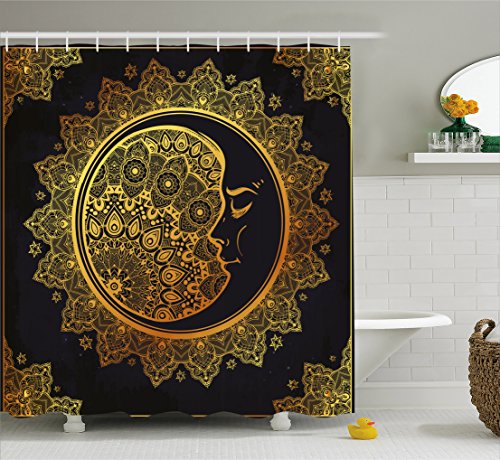 Gold Mandala Shower Curtain by Ambesonne, Intricate Ornate Bohemian Crescent Moon with Star Figures and Mystic Mandala, Fabric Bathroom Decor Set with Hooks, 75 Inches Long, Gold Black