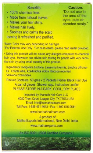Hannah Natural's herbal hair dyes are 100% natural and chemical free. Switch to our all natural product and see and feel the difference. Contains more than 10 natural herbs such as indigo, henna, amla, brahmi, and more that are well known for their herbal benefits in Ayurveda. This particular product gives a deep black hair color and long lasting results over a prolonged period.Feature