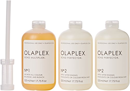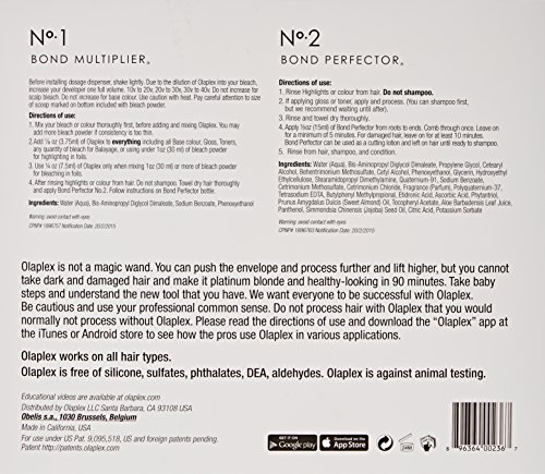 Olaplex salon intro kit perfect for in-salon use. Includes: 1- Olaplex bond multiplier no 1 17.75 Oz 2- Olaplex bond perfector no 2 17.75 Oz Olaplex multiplies and rebuilds bonds to eliminate breakage from chemical services. Push the envelope! Olaplex lets you lighten your client's hair to levels never though possible before, without compromising the integrity of the hair. Works with all manufacturers' formulas, from lightener to color. So simple to use, the professional Olaplex service consists of just 3 easy steps. Olaplex bond multiplier no 1: add directly to lightener or color before application. Olaplex bond perfector no 2: after rinsing hair color, apply for a minimum of 5 minutes then rinse, shampoo & condition. Or, leave in hair to use as a cutting lotion. Olaplex hair perfector no 3: use at home once a week (this products must be purchased separately. Not included in this kit).Feature