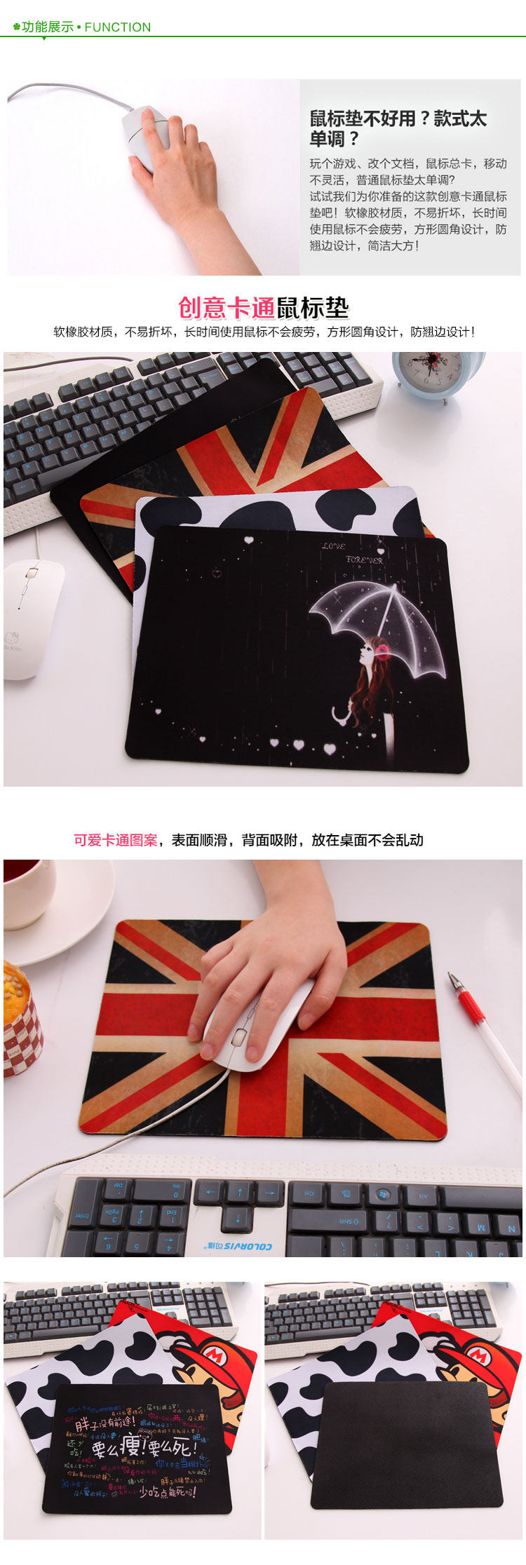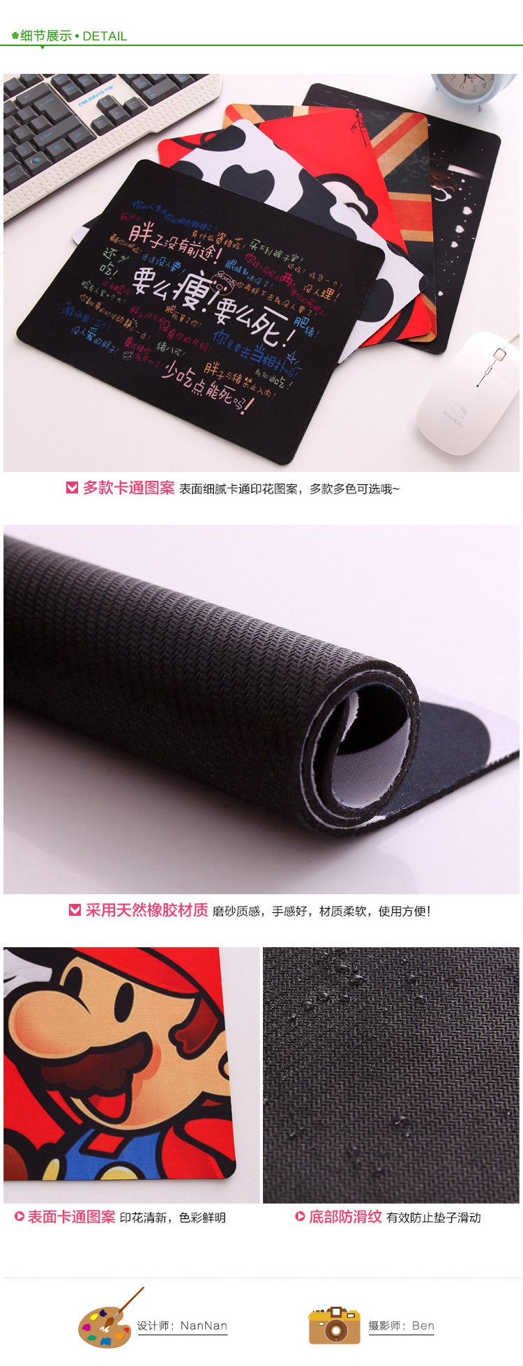 Name: mouse pad animation cartoon keyboard pad Size: About 26cm long and 21cm wide Material: Rubber + Fabric Packing: OPP Weight: 100g Color: color list shown, optional Summary: Gaming mouse, increase thicker, thicker mouse pad, wear without curling, soft and smooth, feel more comfortable operation, as well as animation cartoon printing, fashion cute.