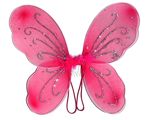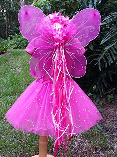 -. Brand : Fairytale Play -. Color : hot pink -. Department : girls -. Feature : Fairy butterfly wings and shimmery glitter measure 17"x14" / Tutu is layers of tulle with shimmery stars that will not come off. / Satin waist band fits 2t to 7 years of age and 12" in length / Pink flower attached to waist / Halo is high quality fabric ribbon and curly ribbon. -. PackageQuantity : 4 -. ProductGroup : Apparel -. ProductTypeName : CHILDRENS_COSTUME -. Size : 2t-8 -. Title : Girls Hot Pink Fairy Costume with Butterfly Wings, Wand, Tutu & Halo -. UPC : 707152214285
