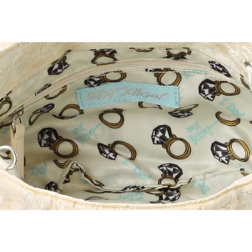 Anticipate an eventful evening enhanced with Betsey's one-of-a-kind clutch Satin overlaid with lace exterior, Pressure snap closure, Lined interior and zipper pocket and Detachable cross-body chain.