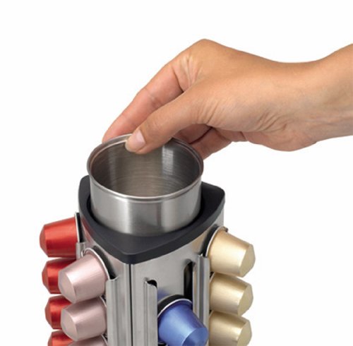 The perfect solution to store nespressoa capsules in a well arranged way, room for 30 nespressoa capsules. the capsules can be easily taken out and are simple to refill. the space efficient design is compact with a large capacity. fits in the classic and modern interior, a stylish timeless design. the handy central container means there is always somewhere to store spoons or to dispose of the empty capsules. the central container is removable for easy cleaning. made of durable corrosion resistant materials, dishwasher safe.