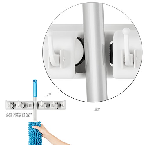 - How to use it? Lift the handle of the mop from the bottom part of the mop holder, once the handle of the mop is inside the slot, release your hand, the rolling ball will automatically grip the mop handle. If you want to use your mop, just lift up the handle of the mop, to loose the rolling ball, then you can take out the mop handle out of the slots. The hooks on the multi-function mop can be used to hold other stuff.
