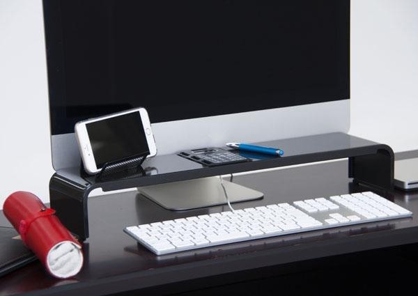 狭いデスクを有効活用☆パソコンの手前に小物を置くスペースができます。キーボードはすべては収まりませんが、ラックの下にある程度収納できます。パールマイカ塗装による高級感のある光沢と、シンプルで飽きのこないデザイン。様々なインテリアと調和します。 |