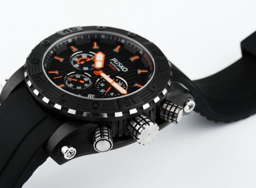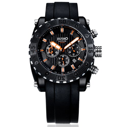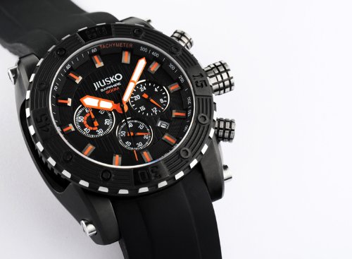 The JIUSKO Deep Sea divers chronograph: a watch as at home in the depths of the ocean as it is at the time trials for Lemans!In the world of sport watches, both divers and chronographs rule. In this beautiful timepiece from JIUSKO, the two are married into one superb watch. The case, PVD-Ionic plated in black, is made from surgical stainless steel, which resists corrosion and will look handsome for many years. It is also modern-sized, at 43mm across and 15mm thick. The well-machined divers bezel compliments the textured dial and allows for another method of timekeeping. The Japanese made quartz chronograph movement will also allow you to time events up to sixty minutes, and the tachymeter scale on the chapter ring of the dial will even make it possible to find the speed of a race car over a set distance.