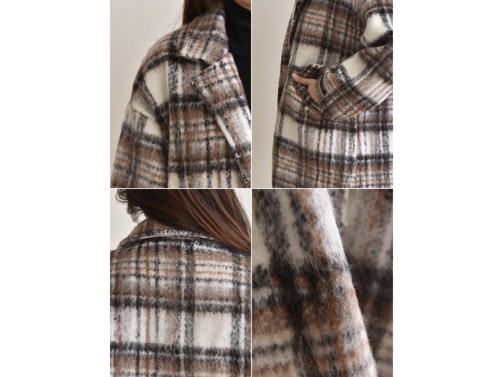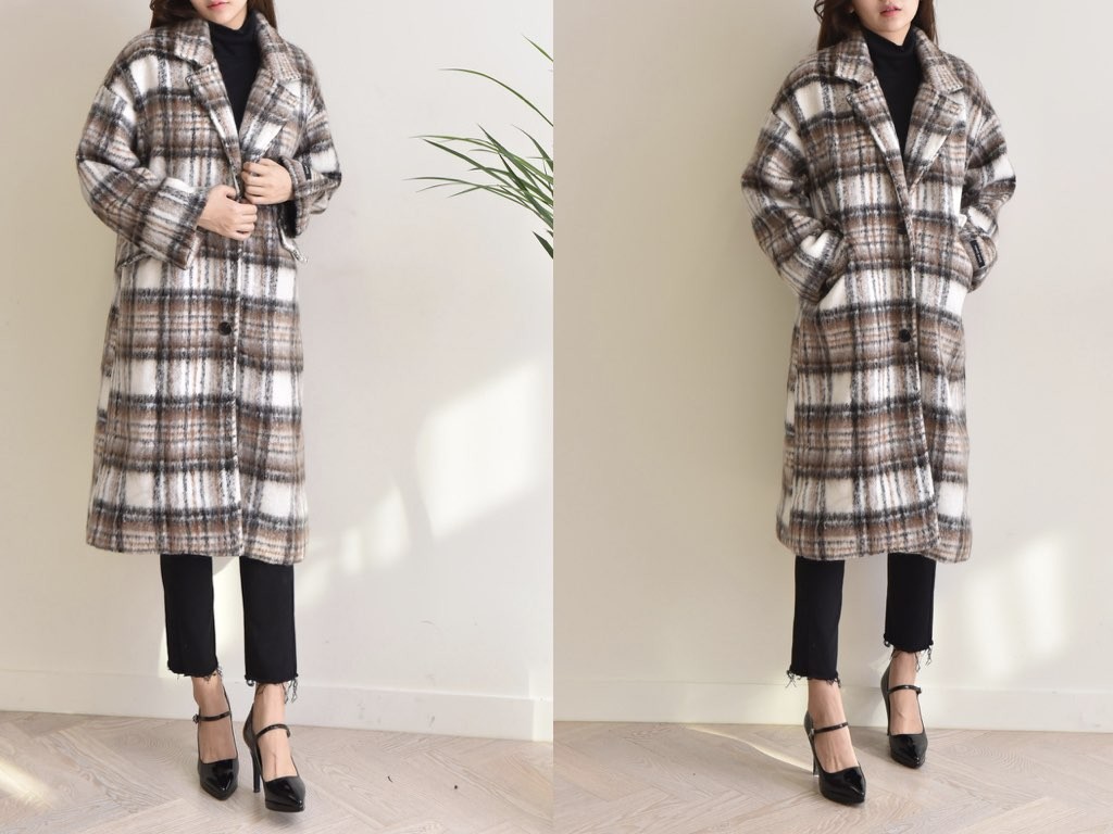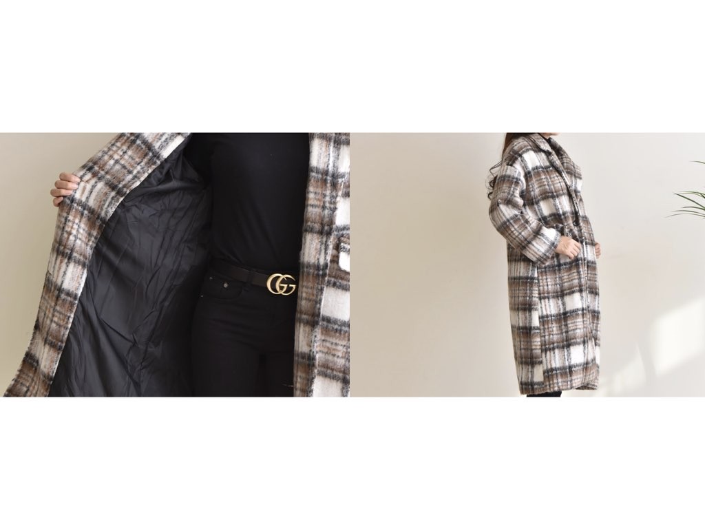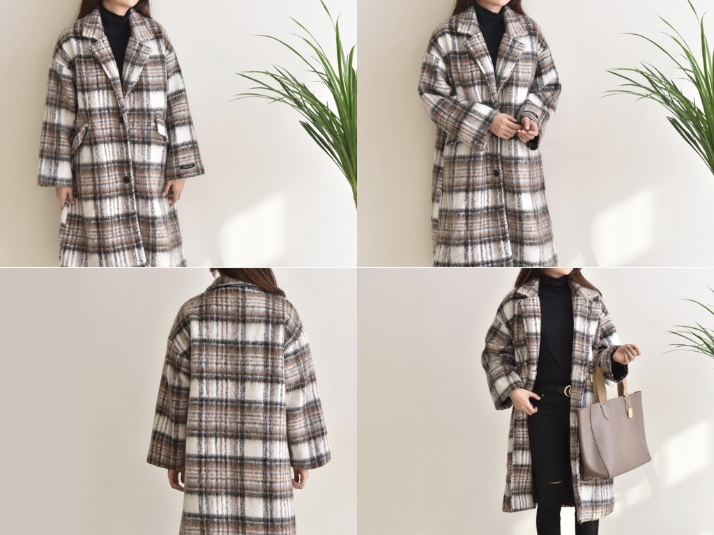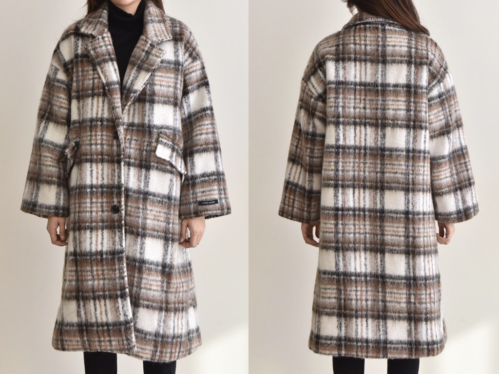 ベーシックなチェックコートです。さらりと着流せる長め丈です。これ一枚で旬な着こなしが実現しますね。商品は、とても丁寧なつくりとなっています。1.基本情報色:ベージュサイズ:Free素材:ウール混製造国:Korea2.サイズ情報肩幅:57cm身幅(胸断面):55cm 腕の長さ:48cm 着丈(前):105cm (サイズは計る方法に応じて±2〜3cmの誤差があります。ご了承お願い致します)モデル着用サイズ:F※着用モデル(163cm、体重47kg、足のサイズ24.5cm)3.その他の情報厚み:中間透け感:なし伸縮性:なし裏地:あり洗濯方法:ドライ(クリーニング)[注意事項]お取り寄せ商品は、海外より仕入れるため納品まで約10日前後いただきます。また店舗でも販売しており、在庫切れになる場合もございます。ご了承お願い致します。