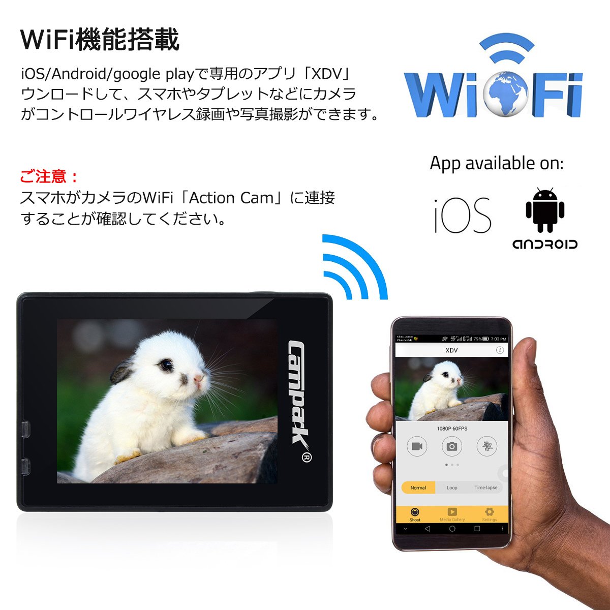 The camera is equipped with WiFi, iOS / Android system is supported, the camera can be remotely controlled with mobile phone & tablet etc