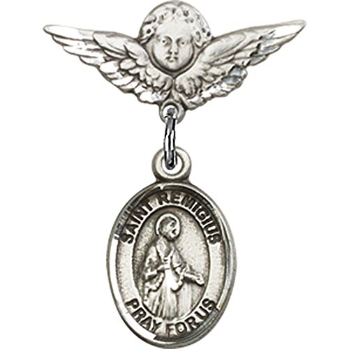 -. Title : Sterling Silver Baby Badge with St. Remigius of Reims Charm and Angel w/Wings Badge Pin 7/8 X 3/4 inches