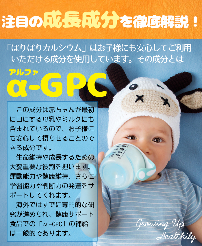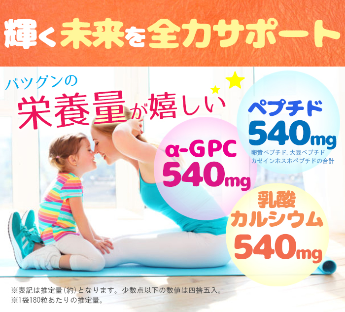 成分 粉末還元麦芽糖水飴、コーンスターチ、乳糖、α-GPC含有食用精製加工油脂末、卵黄ペプチド、L-オルニチン塩酸塩、L-シトルリン、大豆ペプチド、カゼインホスホペプチド/ステアリン酸カルシウム、クエン酸、香料、L-アルギニン、乳酸カルシウム、ビタミンB1、ビタミンB2、濃縮ラクトフェリン、ビタミンB6、ビタミンD、(一部に乳成分・卵・大豆を含む)