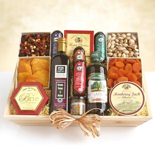 -. Feature : A wooden crate holds California pistachios, tasty dried fruit, a bottle of balsamic vinegar and extra virgin olive oil, brie, Monterey Jack cheese, gourmet cheddar cheese spread. Napa Valley mustard, dried sweet aP.R.Icots, nut and berry trail mix and three flavors of beef salami / Great gift for men, women, couples or the whole family or office / Suitable for any occasion or holiday including Thanksgiving, Christmas, Thank You & Appreciation, Birthday, Thinking of You
