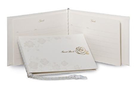 優美なエレガントさと上品さを求めた「桂由美」デザインをゲストブックに表現しました。代表的モチーフ「バラ」をメインイメージに、愛と感謝の気持ちを12本のバラに込めた「ダーズンローズ」をコンセプトとしたデザインです。白を基調とした中に輝きと立体感を演出しました。 |