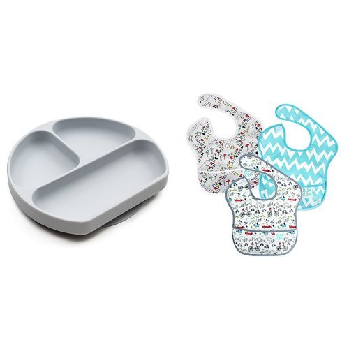-. Title : Bumkins Silicone Grip Dish, Gray bundled with Bumkins Waterproof SuperBib 3 Pack, Urban Bird/Blue Chevron/Gray Bird Park