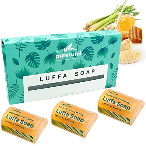 Luffa Soap Gift Box Set of 3 x 100 Grams Lemongrass & Honey Aromatherapy by Puretural Here's your ticket to an extraordinary shower. A loofah and soap in one. All of our handmade Luffa Exfoliating Soaps begin with our signature herbal-based formula and natural honey with moisturizing glycerin. The natural loofah sponge will exfoliate and scrub the skin clean, yet is gentle enough not to strip your skin of its natural oils. If you are struggling with dark spot, stretch mark, stubborn dirt, dirty neck and underarms, unattractive back, dark groin area or blemishes and you need something to get these DIRT & DARK SPOTS removed, then we have exactly what you need!
