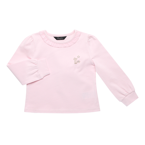깨끗한 연핑크 컬러의 티셔츠 입니다. 목에 컬러 매칭 쉬폰 프릴 장식을 넣어서 러블리한 느낌을 주었습니다. 오른쪽 가슴 상단에는 블링블링한 골드 고양이 핫피스를 넣어주어 프랜치캣만의 고급스러운 느낌을 더해주었습니다. 원피스 안에 레이어드 해서 입거나 바지나 스커트에 코디하시기 좋은 데일리 아이템입니다.
