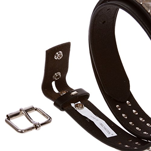 Binding : Apparel Product Description This belt features the most popular two rows of pyramid studs and also removable roller buckle with snaps. This belt size is measured in inches, from the end of the strap where the buckle is attached, to the middle hole at the tip end.The size chart does not include buckle length. There are total of five holes, 1 inch; apart. It is recommended to select size from buckle fold to center hole that better matches measurement of your waist or where you wear this belt. It would be more comfortable to measure where you will wear the belt, add 1-2", and then pick the size where this number falls. 0