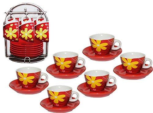 Product Description Beautiful set of 6 ceramic demitasse cups with matching plates. Smart design, cup size: 2 1/4 " high 2 1/9" diamater, matching plates are 4 1/8" diameter. makes a great gift, ideal to use and decorate your kitchen.