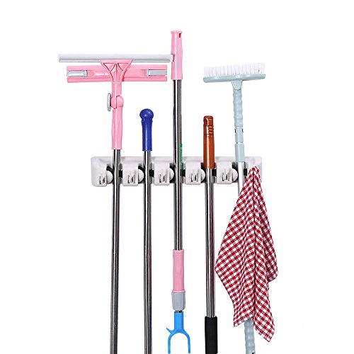 Mop and Broom Holder, Multipurpose Wall Mounted Organizer Storage Hooks, Ideal Broom Hanger for Kitchen Garden and Garage (5 Position 6 Hooks)