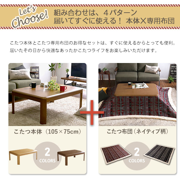 ●木のぬくもりを感じる飽きのこない継脚家具調こたつと、北欧調ネイティブ柄薄掛け布団の2点セット!