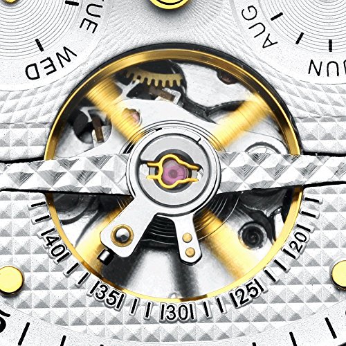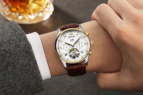 -. Feature : High Quality Material: 100% rand New and original KINYUED mens 30M water resistant watch, automatic self-wind movement, classic rose gold case, genuine leather watch band with luxury stainless steel buckle and scratch-resistant hardlex crystal Dial,(Dial Diameter:42mm, Band Width:20mm, Case Thickness:15mm) / Multifunctional Pendulum Display: skeleton tourbillon mechanical analog watch display with Complete Calendar, auto date day month small dials all work and change automatically. It is possible to fit manually. The double mechanisms watch calendar limit is up to 39 days. / Fashion Style and Works Accuracy: Perfect for all kinds of business, casual, dress indoor activities or daily use. This elegant watch is complement all style men clothes, No battery mechanical movement works accuracy ±15s per day which is worth for every man. / Luxury Gift Package: The watch will be packaged in a watch gift box. Really a great present for your family, friends or lovers on Birthday, New year, wedding ,fathers' Day or Christmas Day. / Purchase Guarantee: Each watch comes with a 12-month warranty and 90-day 100% money back full refund guarantee. If you have any dissatisfaction, please email to our after-sale team, we will refund 100% of your money, no question asked.
