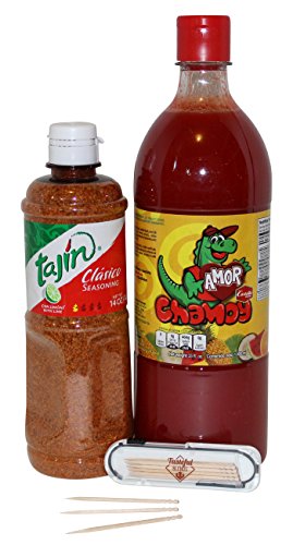 Tajin Fruit & Snack Seasoning 14 oz Bottle and Amor Chamoy Sauce 33 oz Bottle Bundle With 1 Toothpick Carrier From Tasteful Blends