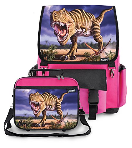-. Brand : Kidaroo -. Department : boys -. Feature : Decorative Flaps On The Backpack & Lunch Box Are Interchangeable! (PATENT PENDING) / Backpack Has A Spacious Main Storage Compartment With A Large Padded Interior Pocket For A Small Laptop Or Large Tablet. Lots Of Pockets. / Thick Padded Back For Comfort With Adjustable Shoulder Straps. / Lunch Box Attaches To The Outside Of The Backpack With Durable Metal Clips And Comes With An Adjustable Tote Strap. / Backpack: 17" x 12" x 7" / Lunch Box 8.5" x 10" x 3.5" -. ProductGroup : Apparel -. ProductTypeName : LAGE -. Title : High Quality Backpack & Lunch Box With Stripped T-Rex Dinosaur Interchangeable Flaps