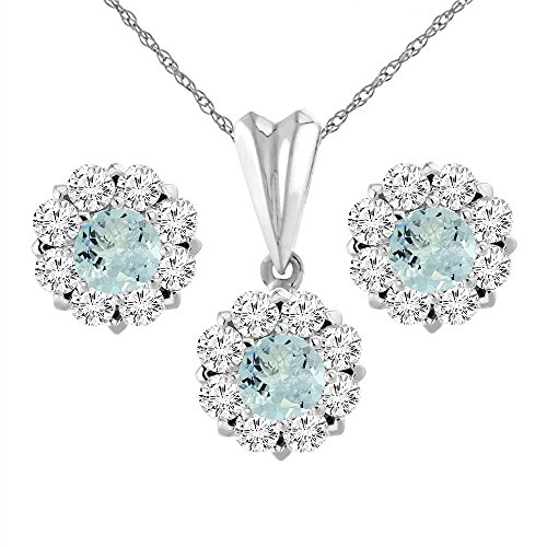 -. Title : 14K White Gold Natural Aquamarine Earrings and Pendant Set with Diamond Halo Round 6 mm