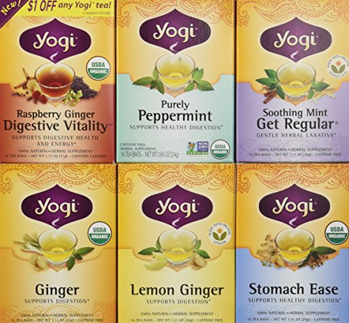 -. Feature : Yogi Tea Digestive Support Tea Variety Pack / Features 6 Varieties of Yogi Tea (Each Box Contains 16 Tea Bags) / Flavors Include: Soothing Mint Get Regular, Ginger, Lemon Ginger, Purely Peppermint, Raspberry Ginger Digestive Vitality, and Stomach Ease / 100% all natural herbal supplement made with non-GMO ingredients