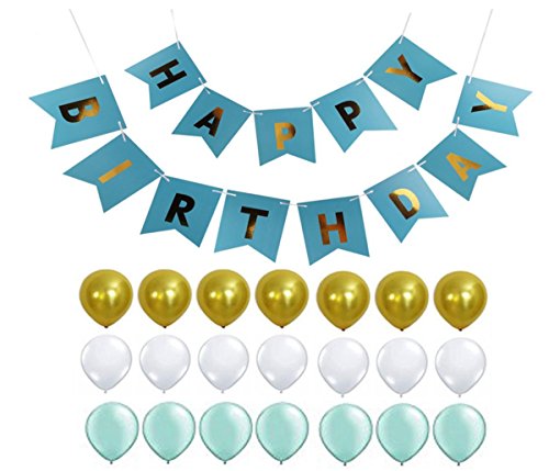 Package Including:13 individual gold foiled letter of Happy Birthday. 21 Pieces 12 Inches Latex Ballons 7* blue, 7* white and 7* gold.
