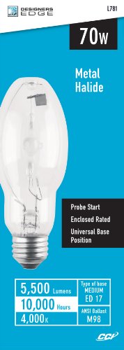 Studio : Coleman Cable Publisher : Coleman Cable Binding : Tools Home Improvement Product Description Designers Edge L781 Metal Halide Pulse Start Medium Base Lamp, 70-Watt. Metal halide pulse start lamps create an abundant amount of light from a relatively small source. Produces 5500 lumens for exceptional light output to your environment. 70-watt Mogul base PSMH bulb ideal for commercial and residential applications. Color temperature of 3200k for a white color. Suitable for Enclosed Fixtures, Universal Burning Position, ANSI code: M98. Intended for use with enclosed fixtures. Medium base is virtually universal and works with most lighting fixtures. High intensity discharge lamps, such as the metal halide bulb, is a source of light from a "point", providing good optical lighting control. Compatible with 130-volt applications. TOLL FREE HOTLINE, 1-800-561-4321. If you have immediate questions about application, installation, troubleshooting, or a damaged component, please call CCI Consumer product hotline at 1-800-561-4321 or email questions to: CCI.ConsumerSupport@southwire.com. The Designers Edge (R) brand is a registered trademark of Coleman Cable Inc. 0