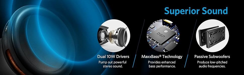 - Enjoy crisp, clear audio with impressive volume powered by dual ten-watt drivers.
