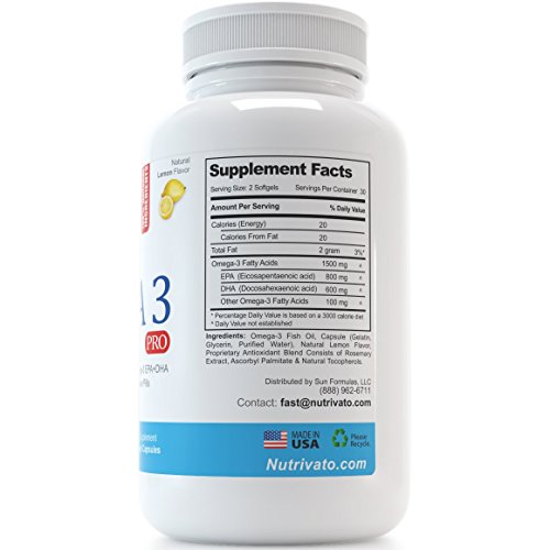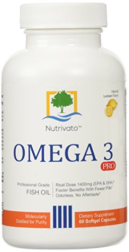 -. Feature : TODAY'S special Coupon - SAVE 10% when you buy 3 or more :: Enter code SALE7310 at checkout / PURITY & SAFETY - Third party tested for purity, ingredient safety, projected efficacy and label accuracy. Mercury free. Pharmaceutical grade omega 3 pro fishoil made in the USA. Contains doctor recommended levels of omega-3 EPA and DHA essential fatty acids for optimal help in reducing Inflammation and Joint Pain. Soothes Joint Pain. Supports Heart health, Brain health, Mood, Memory, Focus, Productivity, Cognitive function, Skin, Hair and Eyesight / TRIPLE STRENGTH BLEND 1,400mg pure omega 3 (800mg EPA and 600mg DHA) per serving. Deep sea fish oil. Easy-to-swallow softgels. Burpless. No fishy aftertaste / MADE IN THE USA in a state of the art FDA registered facility - Nutrivato formulates premium nutritional supplements in therapeutic doses in accordance with clinical evidence and studies. Molecularly distilled for purity. Mercury free. No PCBs. Non-GMO / 100% HASSLE-FREE GUARANTEE - World class customer support. Either you fall in love with Omega-3 Pro or we will make it up for you. Hassle-free 100% money-back guarantee. No questions asked