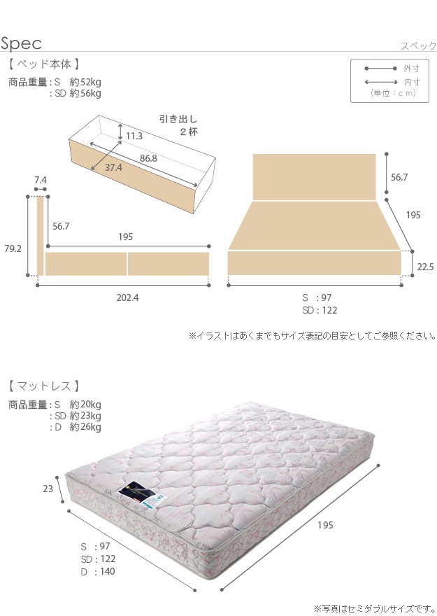サイズ(cm):[ベッド]幅122x奥行202.4x高さ79.2(床板高さ22.5)cm・約56kg、[マットレス]幅122x奥行195x高さ23cm・約23kg
