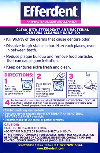ReleaseDate : 2015-10-01 Studio : Medtech Product Inc. Publisher : Medtech Product Inc. Binding : Health and Beauty Product Description Clean with this denture cleanser at least once a day to: kill 99.9% of the germs that cause denture odor, dissolve tough stains in hard-to-reach places, even in between teeth, reduce plaque buildup and remove food particles that can cause gum irritation, keep dentures extra fresh and clean. Directions: 1. Drop one tablet into enough very warm water to cover denture. 2. Place denture into effervescing solution, which will change color as it cleans. 3. After 5 minutes, remove and rinse denture thoroughly. Denture is clean and odor free. 4. For best results, brush denture by using the denture cleanser solution and then rinse denture again. Immediately throw away solution. Do not gargle or rinse mouth with solution. Can be used in any denture bath. Dentures may be soaked safely in denture cleanser overnight. Recommended for use on full or partial dentures. 0