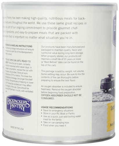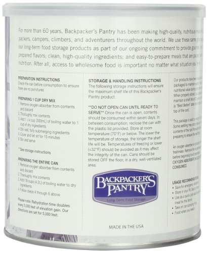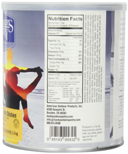 -. Feature : 18, 1-cup servings; $3.89 cost per serving; / 25-year shelf life; Gourmet emergency food storage solution / Easy to prepare, just-add-boiling-water meal / Store in your RV, Boat or Pantry; Take on car-camping trips; Save for emergency situations; Food when you need it. / Made in the USA by Backpacker's Pantry, a family-owned and operated company celebrating 61 years of business. / A delicious New Mexican green chili with chicken and cheese served over rice / Just add boiling water for a delicious meal in minutes / Can make up to 18 servings and has a shelf life of 25 years / Use within 7 days of opening, perfect for long trips with lots of hungry hikers / Made in Boulder, Colorado, USA