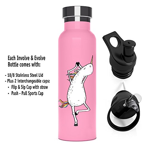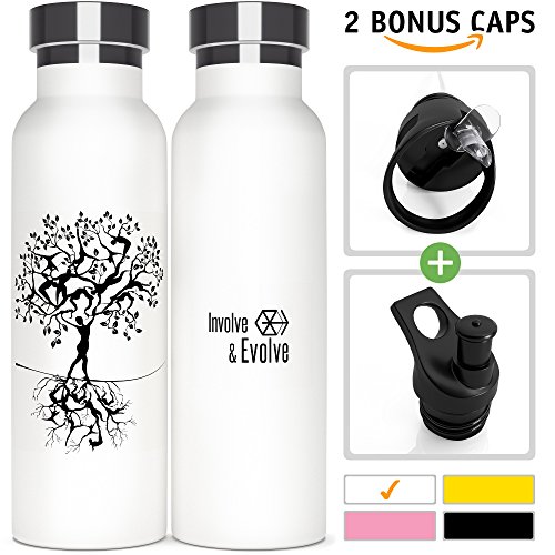 • EVERY SET INCLUDES: 1 Bottle + S/Steel Lid + Flip & Sip Cap with Straw + Push-Pull Cap.• Our thermal water bottles are made of food grade 18/8 stainless steel. Stainless steel water bottles are considered safer than aluminum or plastic ones. 304 stainless steel is a rust-resistant and neutral metal, so it will not leach toxic chemicals into your water or leave a metallic taste. Stainless steel is also free of compounds, such as BPA, PVC, cadmium, and lead.• Involve & Evolve cares about the environment. In production, we use eco-friendly materials. Also, we want to encourage you to use, reuse and eventually recycle our bottles. The 20oz water bottle holds enough of liquid to keep you hydrated during a bike ride, a day on a beach, at school or work. You can always refill the bottle and at the same time reduce plastic consumption.• This insulated water bottle with straw is multifunctional. The high-quality powder coating design makes the bottle suitable for all indoor and outdoor activities. To make the bottle easier to travel with, you can attach a carabiner to the sports lid and clip it to a bag or backpack. •Our black and white stainless steel water bottle is double walled. It works as a thermos and will allow maintaining the temperature of your hot, iced, or chilled drinks for many hours. The bottle will never get hot to the touch. Also, our vacuum insulated water bottle is sweat proof.• The art designs on the bottles (tree of life / running man) suit adults and teenagers, women and men. They are also a great gift idea. Even though they are not dishwasher safe, ice cube wide mouth opening makes it easy to clean.• We want you to LOVE your Involve & Evolve Bottle. If you are not satisfied for any reason you may return it for a refund with no questions asked within 90 days of receipt.Feature