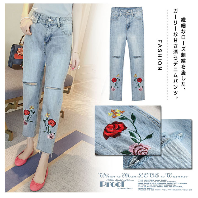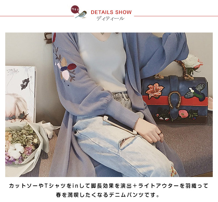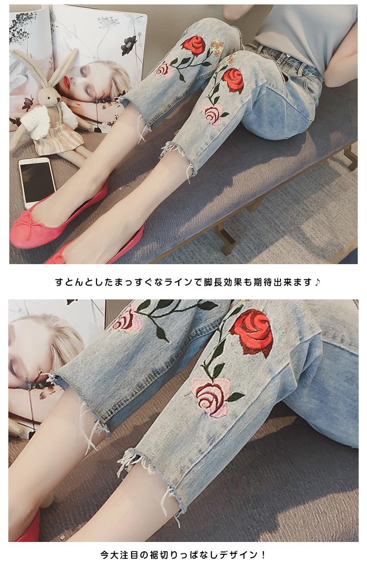 | 繊細なローズ刺繍を施した、ガーリーな甘さ漂うデニムパンツ。ゆったりとしたシルエットが、気になるレッグラインをさり気なくカバーしてくれます。ひざにダメージを入れて、細部までこだわったデザインです♪コートやジャケットはもちろん、春ニットやカーデなどとコーディネートすればカジュアルStyleを気軽に楽しむことができます。 | |