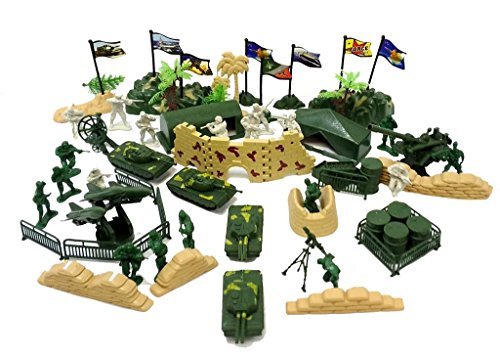 -. Feature : 82 pieces stored inside bucket with carry handle! Dimensions: 8" Height x 6.5" Diameter. / Includes: tanks, cannon, triple missile launcher with launcher pad, blockade fences, blockade brick walls, / Flags, army men, stands and other accessories. Green and light gray soldiers measure 2" in height. / Cannon Blaster: 6"L x 1.5"W x 3.5"H. Triple Missile Launcher: 4.5"L x 3.5"W x 3"H. / Tanks Dimensions: 3.5"L x 1.25"W x 1.25"H. Fence: 2.25". Barrel: 1.25" x 1".