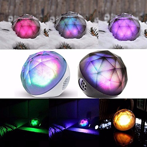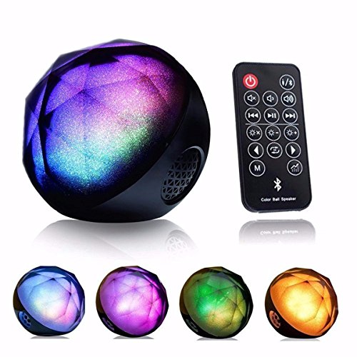 Feature : Remote controls the power on/off, light settings, volume settings, mode swapping. The remote fits in its own little slot in the back of the speaker, so it will not get lost easily / Color Ball LED Bluetooth Speaker combines outstanding sounding speaker with a built-in light show. It's gorgeous because the rainbow colors sparkle like shimmering frost or glitter from inside the speaker / The LED can produce 16 million color combination, You could choose from a single solid color, to rainbow, to a choice of three different tempo lights to match the beat of the music / Comes with the remote controller, When you Control it, it will flash different beautiful and delicate colors lighting dark rooms or space, Enjoy the music as you wish / You can listen music indoor or outdoor from your device in bluetooth pairing mode or wire connected mode