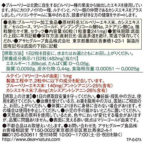 栄養成分 : 1日目安摂取量2粒中エネルギー 1.87 kcal たんぱく質 0.0063 g 脂質 0.0092 g 炭水化物 0.44 g ナトリウム 0.29 mg ブルーベリーエキス末(*1) 140mg配合 カシスエキス末(*2) 20mg配合 ルテイン(*3) 1mg、*1 ブルーベリーエキス末にはアントシアニジン25%含有しています。 *2 カシスエキス末はカシスアントシアニン10%含有しています。 *3 ルテインはマリーゴールド由来です。